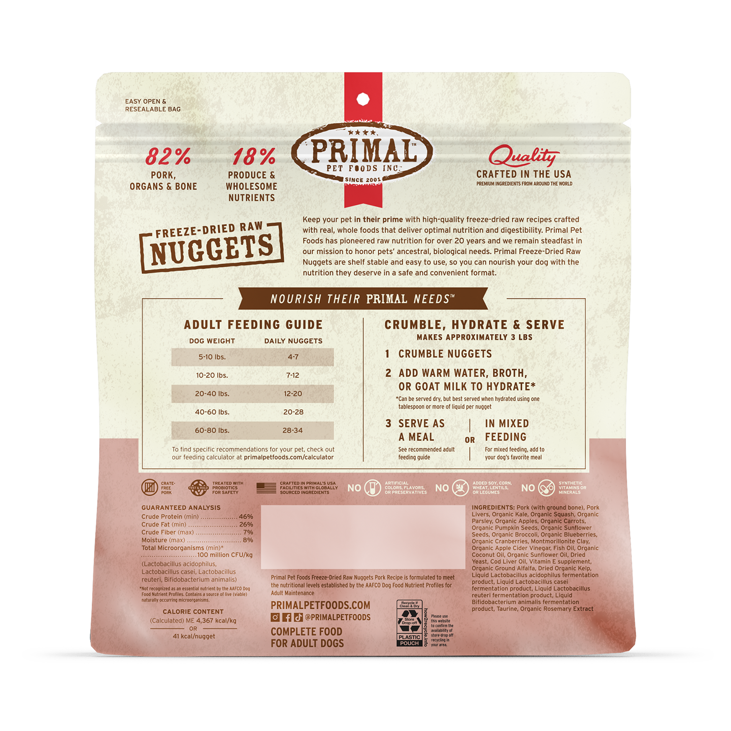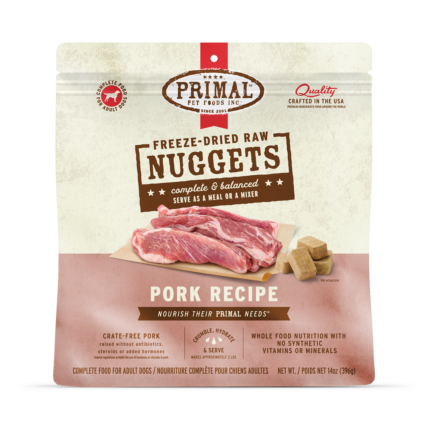 Primal Pet Foods' Freeze-Dried Raw Nuggets Dog Food is crafted in the USA using raw meat from premium protein sources raised without steroids or added hormones.