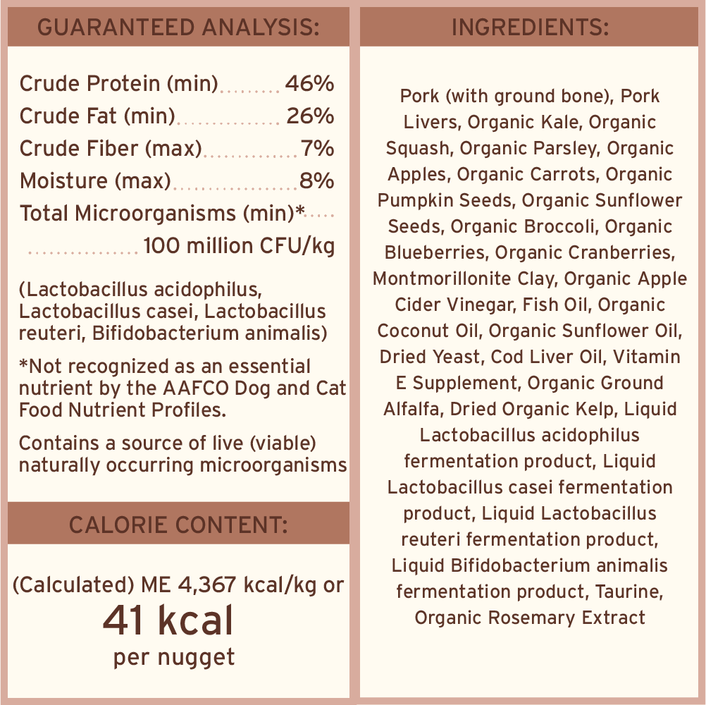 Pork (with ground bone), Pork Livers, Organic Kale, Organic Squash, Organic Parsley, Organic Apples, Organic Carrots, Organic Pumpkin Seeds, Organic Sunflower Seeds, Organic Broccoli, Organic Blueberries, Organic Cranberries, Montmorillonite Clay, Organic Apple Cider Vinegar, Fish Oil, Organic Coconut Oil, Organic Sunflower Oil, Dried Yeast, Cod Liver Oil, Vitamin E Supplement, Organic Ground Alfalfa, Dried Organic Kelp, Liquid Lactobacillus acidophilus fermentation product, Liquid Lactobacillus casei fermentation product, Liquid Lactobacillus reuteri fermentation product, Liquid Bifidobacterium animalis fermentation product, Taurine, Organic Rosemary Extract