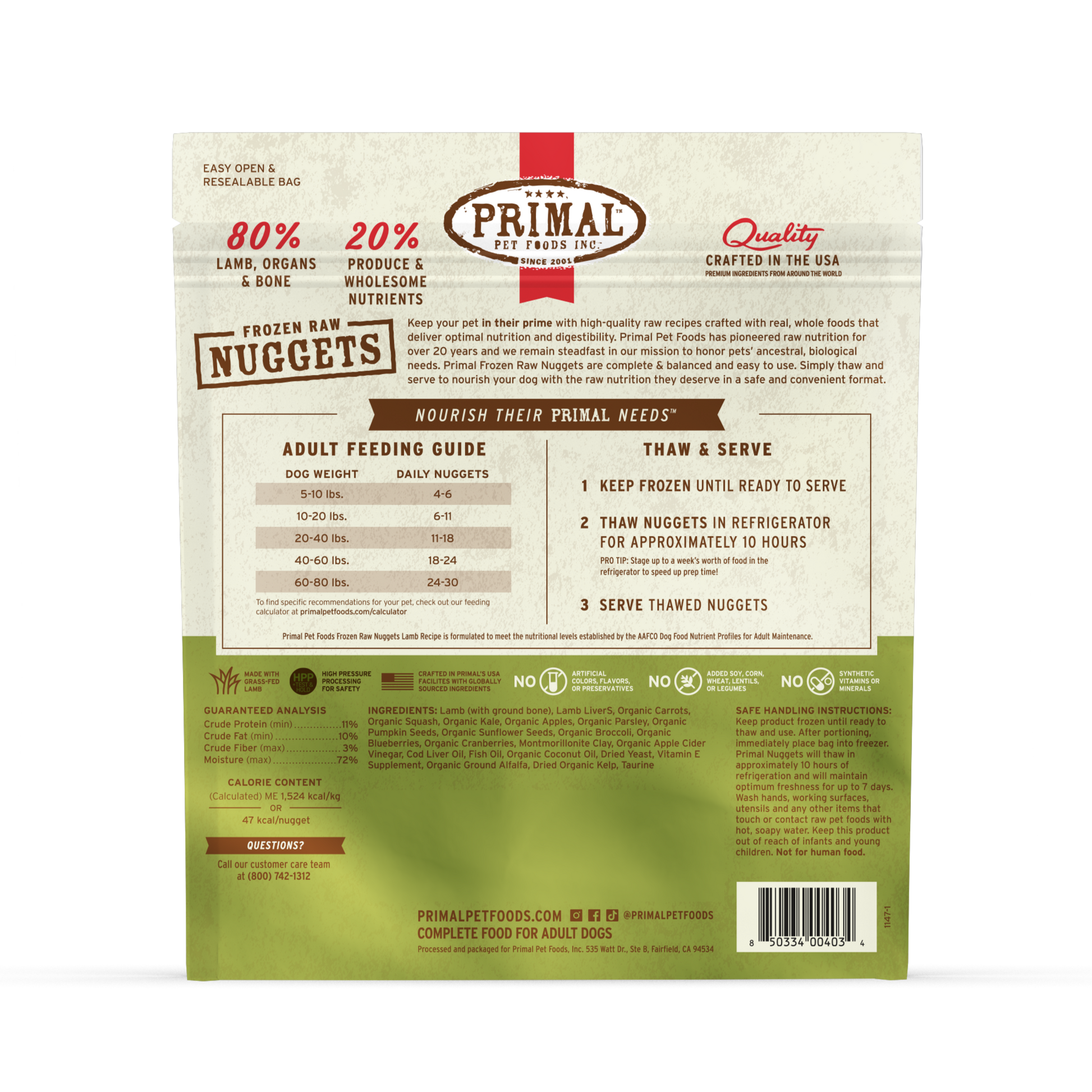 Keep product frozen until ready to thaw and use. After portioning, immediately place bag into freezer. Primal Nuggets will thaw in approximately 10 hours of refrigeration and will maintain optimum freshness for up to 7 days.