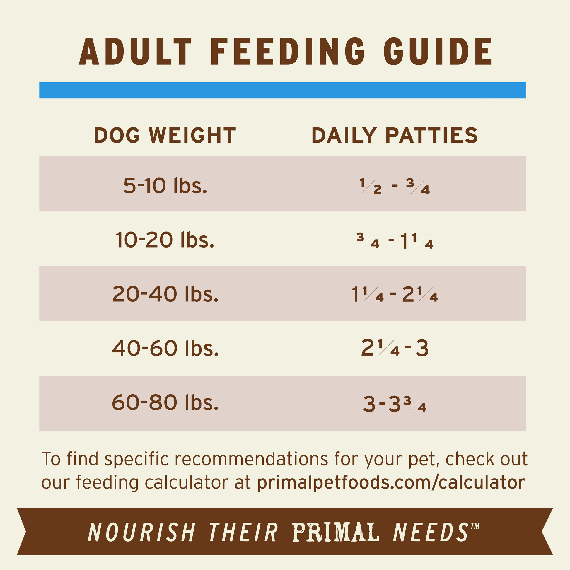 Keep product frozen until ready to thaw and use. After portioning, immediately place bag into freezer. Primal Patties will thaw in approximately 10 hours of refrigeration and will maintain optimum freshness for up to 7 days. Wash hands, working surfaces, utensils and any other items that touch or contact raw pet foods with hot, soapy water. Keep this product out of reach of infants and young children.