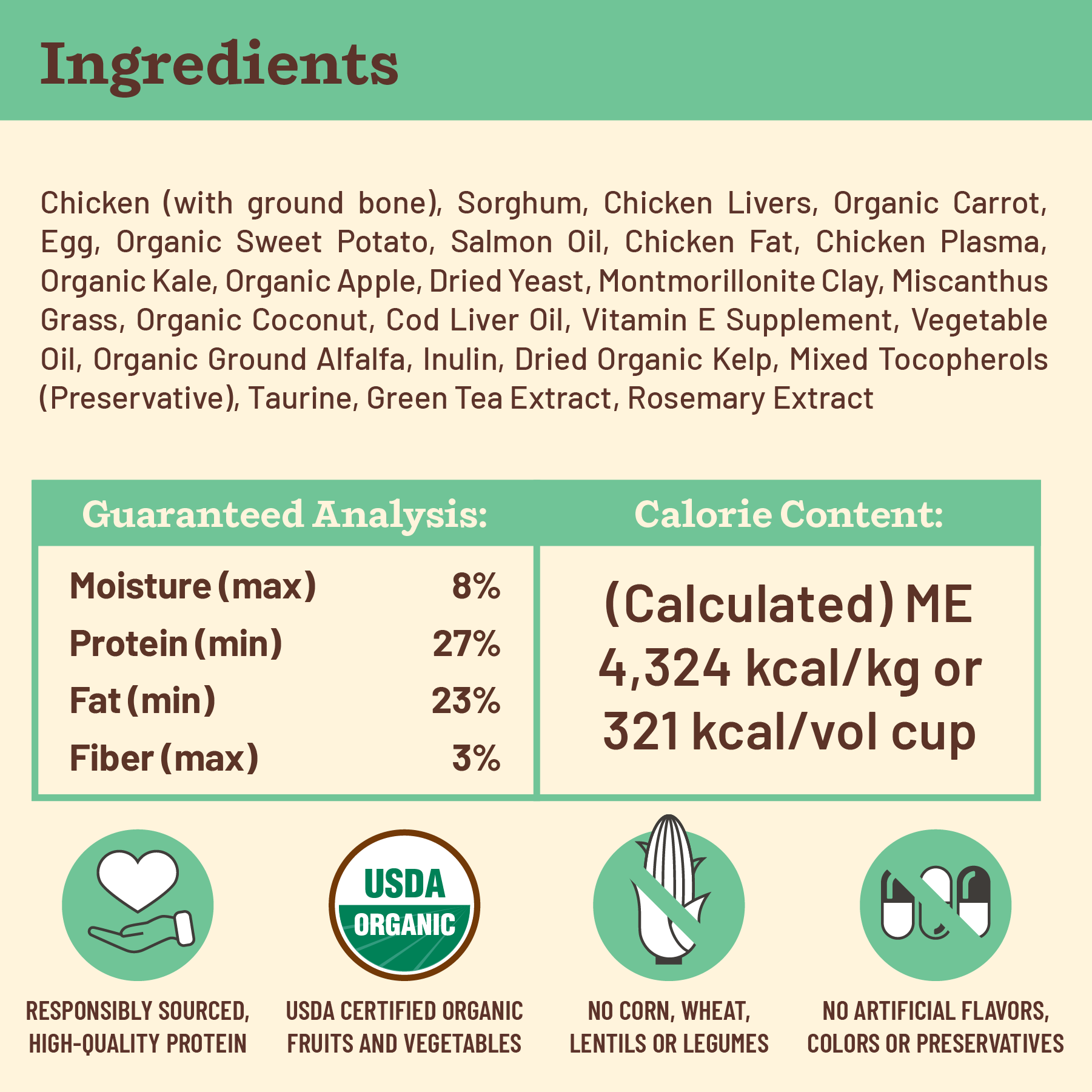 | Calories | 4324 kcal/kg or 321 kcal per volumetric cup |